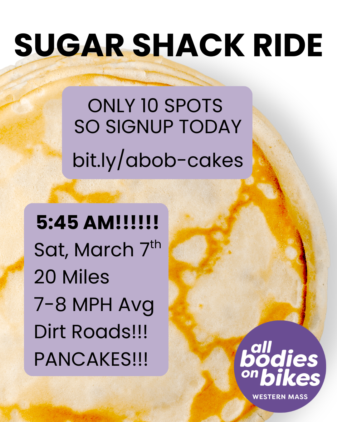 We'll meet near the end of the rail trail in Southampton at 5:45 AM on Saturday, March 7th. We'll set off on a 10 mile mixed terrain (dirt and paved roads) ride to Steves Sugar Shack, where we'll eat food with fresh, local maple syrup, YUM!